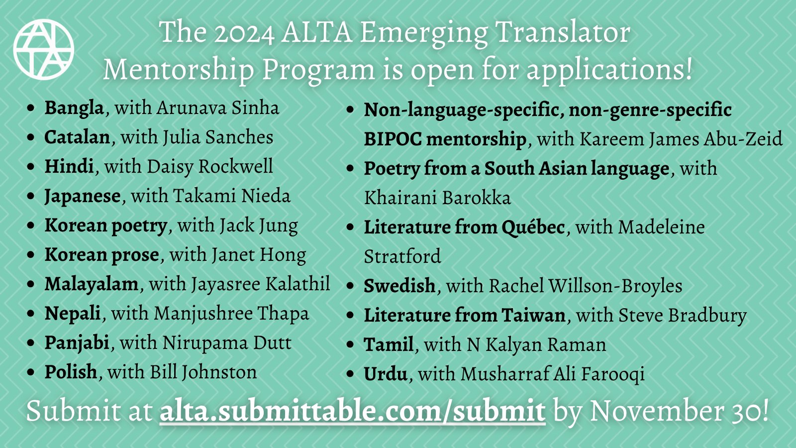 2024 ALTA Emerging Translator Mentorship Open Call!